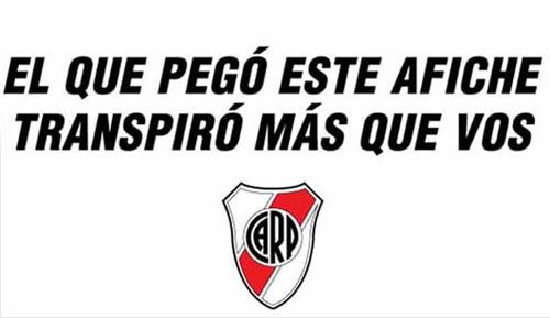 En otro de los carteles, anticipados por la página web oficial de River , se puede ver el escudo del conjunto que dirige Passarella con la inscripción «el que pegó este afiche transpiró más que vos».