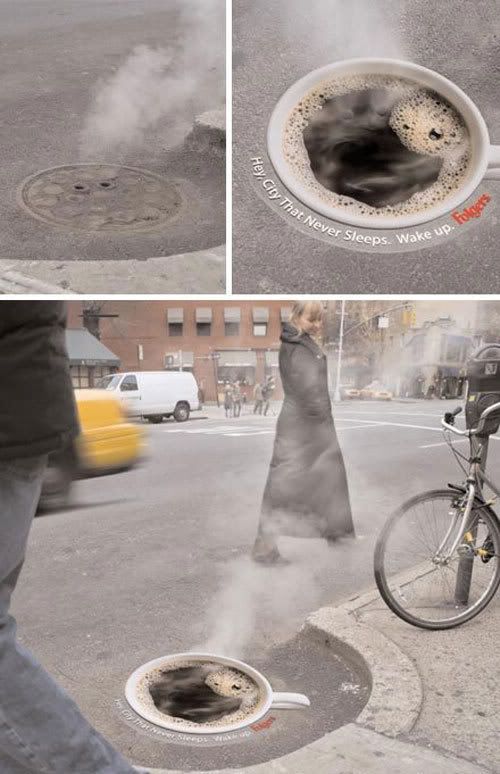 Una impresión de una taza de café Folgers fue colocado en la parte superior de tapas de cloacas en la ciudad de Nueva York. Los agujeros en la impresión están en el mismo lugar que los de la tapa y permite que el vapor salga simulando un café caliente.