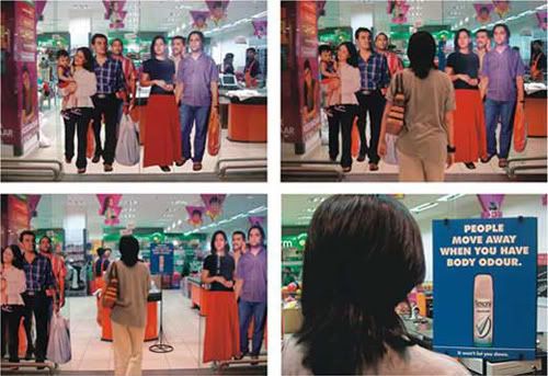 Esta es una publicidad de los desodorantes Rexona que utiliza plotters con imágenes de personas que se pusieron en las puertas corredizas automáticas en un centro comercial en Mumbai, India. Cuando alguien se acerca a las puertas, estas se abren y crea una sensación de que la gente se separa cuando vos te acercas. Detrás de la puerta la gente se encuentra con un cartel que dice «La gente se aleja cuando usted tiene olores corporales «.