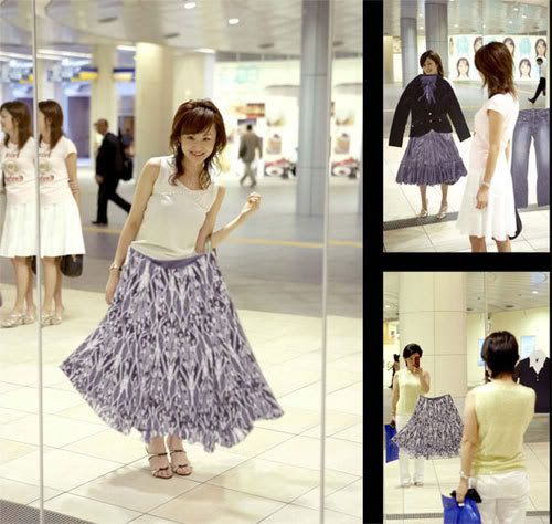 Un espejo gigante se construyó con el fin de que los transeúntes puedan detenerse y mirar en él un reflejo de como se verían vestidos con la ropa que venden en un centro comercial en Tokio, Japón