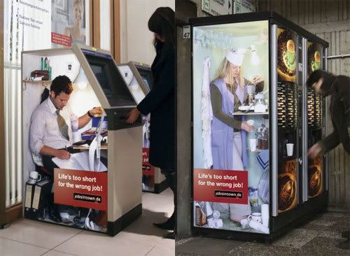 Publicidad para una agencia que consigue trabajos en Berlín, Alemania. La publicidad ilustra a personas que trabajan en las máquinas expendedoras, cajeros automáticos, y el mensaje dice «La vida es demasiado corta para tener el trabajo equivocado«.