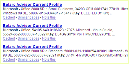 De inmediato, un listado enorme saltará en la pantalla con miles de números de serie de muchas aplicaciones. Los resultados de hecho son seriales de software en inventario de muchas empresas que usan Belarc Advisor, un software para hacer respaldos de licencias de software y cuyos listados han sido dejados en directorios de acceso público en los servidores, por lo que buscadores como Google tienen acceso sin limitaciones.